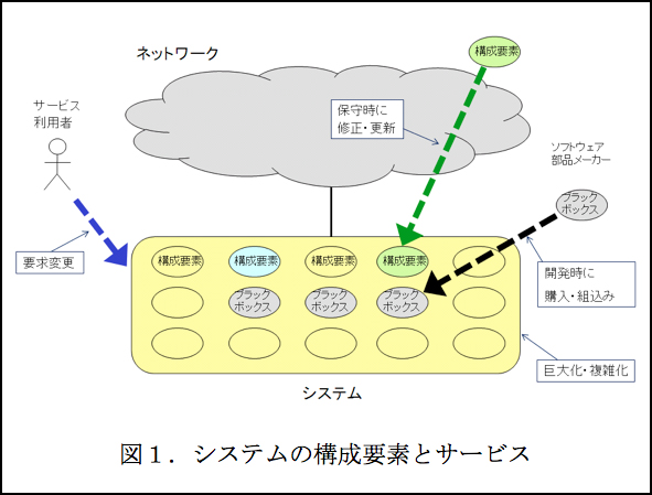 現代の大規模ソフトウェアシステムは利用者の多種多様なニーズに対応するために高度化、巨大化、複雑化の一途をたどっている。このようなシステムの開発においては、開発期間を短縮し、開発コストを下げるため、既存のソフトウェアを再利用し、あるいは他社から供給されるソフトウェア部品をブラックボックスとして使うケースが増えて来ている。また、システム運用中にサービスの向上や変更のための仕様変更が行われ、システムのサービスを中断することなく、ネットワークを介して修正がダウンロードされることも一般的である。そのため、開発からサービス終了に至るすべての時点に対して、設計者・開発者や運用者がシステムの隅々まで完全に理解することが極めて難しくなって来ている(図1参照)。
