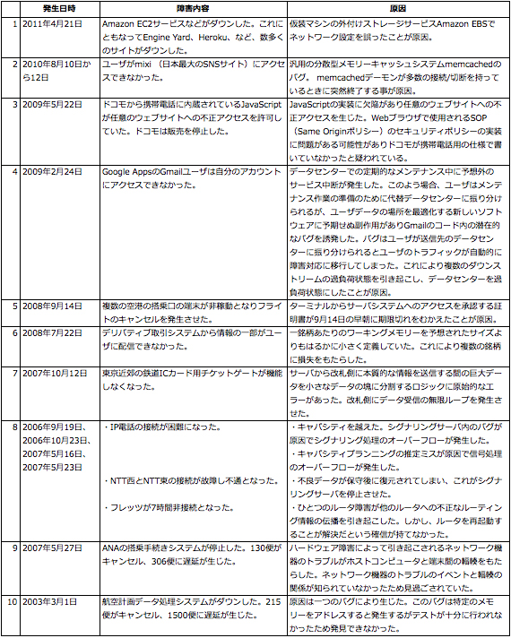 しかしながら、ディペンダビリティの研究やそれに基づいた技術の開発にもかかわらず、近年においても大規模ソフトウェアシステムの障害が発生している。それらのいくつかの例を付録A.4 に挙げた。障害原因を分析すると、システム構築の際に全ての構成要素を理解しないまま開発を進めたことによるもの、利用者数やトランザクション数、さらにはデータ量や処理範囲が当初の設計値を越えたことによるもの、利用者の要求変化に応えるために機能を追加・変更した際に発生したシステムの動作の不整合によるもの、などが顕著である。加えて、プログラマーやオペレータによる不用意なミスが連鎖的にシステム全体のダウンを引き起こした例もある。