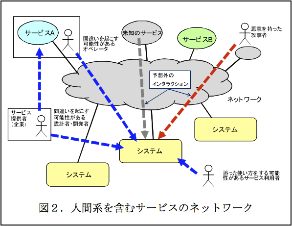現代のソフトウェアシステムの多くは、ネットワークを介して他のシステムと接続された形でサービスを提供している。利用者は直接的には一つのサービスドメインが提供するサービスを利用するが、間接的に他のサービスドメインが提供するサービスを利用していることがある。そしてそれらのサービスドメインは異なる所有者によって所有され、運用されていることが多い。その場合、サービスの項目や内容、処理性能、インタフェース仕様などが十分に告知されないまま変更される可能性があり、未知のサービスが適用されたり、時にはサービスが終了される場合もある。ネットワーク自体のサービス項目や内容、処理性能、インタフェース仕様も変更されたり、一時的にサービスが停止することもある。このように、利用者から見たとき、あるいはシステム開発者から見たときに、システムあるいはサービスドメインの境界も不明確となる。これに加えて、あるいは悪意を持った攻撃者が意図的に攻撃してくる恐れもある。このように、ネットワーク化に伴う予測不能性が増えている(図2参照)。