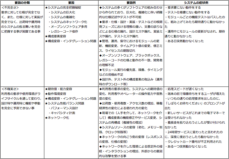 システム障害の原因を見ると、システム構築の際にすべての構成要素を理解することが不可能であったために発生したもの、利用の量や利用の仕方が当初の設計値を超えたことによるもの、利用者の要求変化に応えるためにシステムを変更した際に発生したシステム動作の不整合によるもの、などが顕著である。これらの障害原因を見ると、現代のシステムは作られ方の観点でも、使われ方の観点でも、もはやシステムの機能や構造、境界が定義可能な固定的なシステムとして取り扱うことは困難であり、当初より時間の経過とともにそれらが変化しつづけるシステムとして取り扱うことが妥当であると思われる。