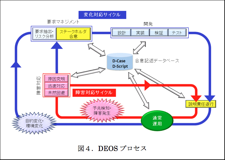 前章で定義したように、オープンシステムディペンダビリティは「変化しつづけるシステム」に対するディペンダビリティである。オープンシステムディペンダビリティの実現のためには、反復的プロセスとしてのアプローチが必須であり、そのようなプロセスは、目的や環境の変化に対してシステムを継続的に変更して行くためのサイクルと、障害に対して迅速に対応するためのサイクル、を備えていなければならないと考える。そして、それらのサイクルからなるプロセスは、構成要素として要求マネジメントプロセス、開発プロセス、通常運用プロセス、障害対応プロセス、説明責任遂行プロセスなどを含む「プロセスのプロセス(Process of Processes)」であり、それらの構成要素プロセスは相互に有機的に結びつけられていなければならないと考える。我々はそのような統合的反復プロセスとしてDEOSプロセスを提案する。