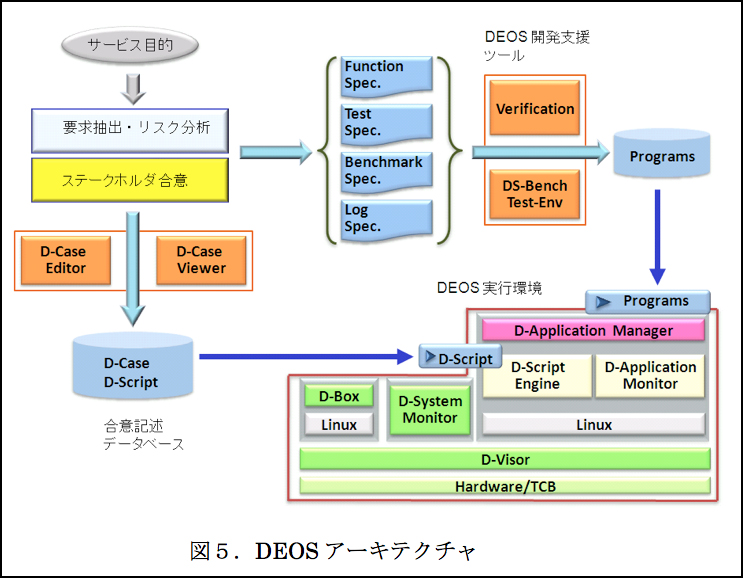 実際のところ、オープンシステムディペンダビリティ(OSD)の概念やDEOSプロセスはディペンダブルなシステムソフトウェアの構築に応用できるだけでなく、大規模かつ複雑で変化を許容しなければならない多くのシステムをディペンダブルに構築するための方法論になる。すなわちDEOSプロセスは広範なオープンシステムに適用できる。この意味で議論を進める時は「DEOS」を「オープンシステムのためのディペンダビリティ工学(Dependability Engineering for Open Systems)」の略記とする。一方、このWhite Paperに記したDEOSアーキテクチャは組込みシステムを含む現代の大規模で複雑なソフトウェアシステムのためのものである。この意味で議論を進める時は「DEOS」を「ディペンダブルな組込み用オペレーティングシステム(Dependable Embedded Operating Systems)」の略記とする。